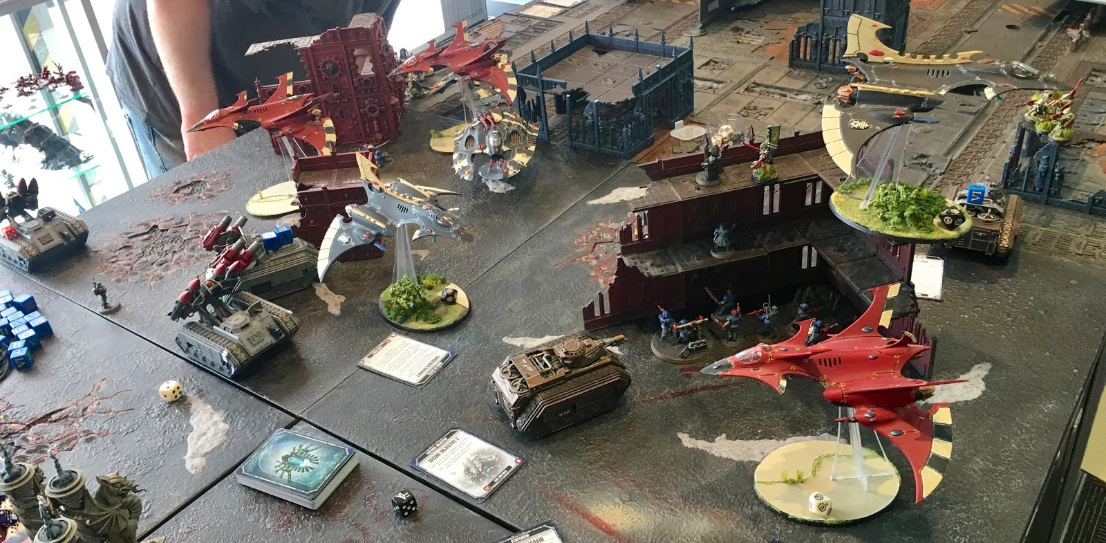 Both Wave Serpents emptied as Dire Avengers rushed out from them, surrounding the Autarch and Farseer, and supported by their wave serpents. The Ulthwe airforce agressively swept in and the formation was, on its face, similar to the way Imperial forces tend to castle. On the Aeldari left flank, near the rangers the Warp Spiders apparated just as the Striking Scorpions appeared from the shadows.